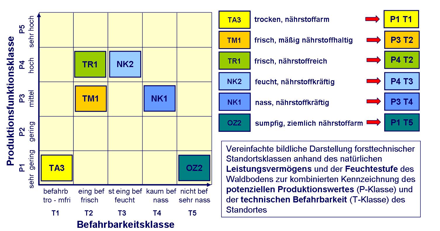 Die zwei Eingangsgrößen zur Zuordnung eines bestimmten Waldstandorts zu einer modifizierten forsttechnischen Standortsklasse sind der potenzielle Produktionswert (P-Klasse) und die technische Befahrbarkeit (T-Klasse) (Abb. 1.). Mit Hilfe eines speziellen Bewertungsschlüssels werden das Leistungsvermögen und die Bodenfeuchte der verschiedenen Waldstandorte in jeweils fünf P- und T-Klassen unterteilt (Abb. 2.).