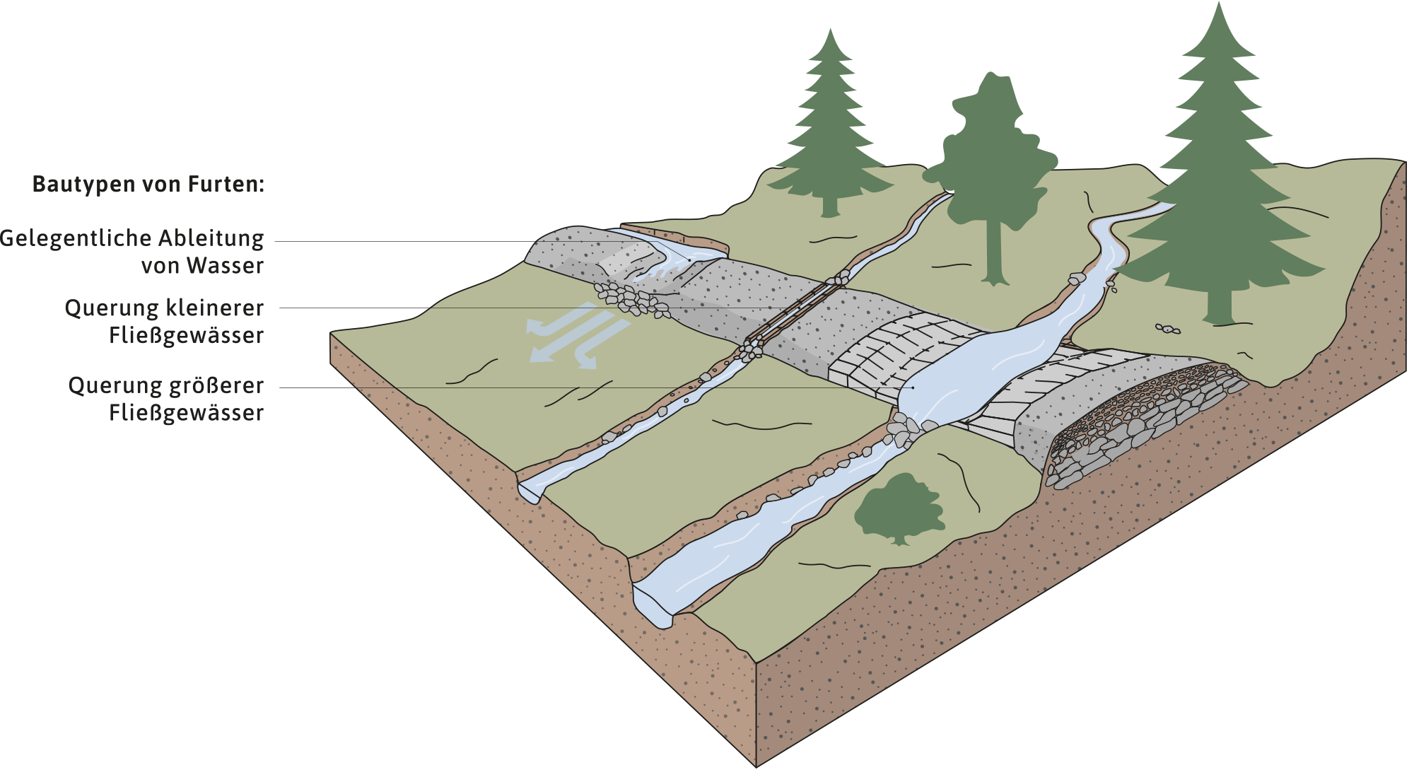 Furten gibt es in unterschiedlichsten Ausführungen. Bei befahrbaren Querungen größerer Fließgewässer bestehen Furten häufig aus einer etwa 40 cm hohen Steinsohle, die auf einem etwa 20 cm mächtigen Schotterbett gelagert ist. Für die Niedrigwasserführung kann in die Furt eine gemauerte Rinne eingearbeitet werden. Um Auskolkungen im Wegumfeld zu verhindern, müssen die Randbereiche der Furt bspw. mit Flussbausteinen befestigt werden. Wenn nötig, kann die Querneigung des Wegs leicht (bis maximal 7 %) erhöht werden, um eine große Absturzhöhe talseits des Wegs zu vermeiden. Bei Querungen kleinerer Fließgewässer genügt oft eine schmale Furt, bei der die Durchflussrinne mit Natursteinreihen baulich gesichert wird. Wird über die Furt nur gelegentlich Wasser abgleitet (z.B. aus Wegeseitengräben), reicht ein einfacher, im Weg vertiefter muldenförmiger Überströmungsbereich.