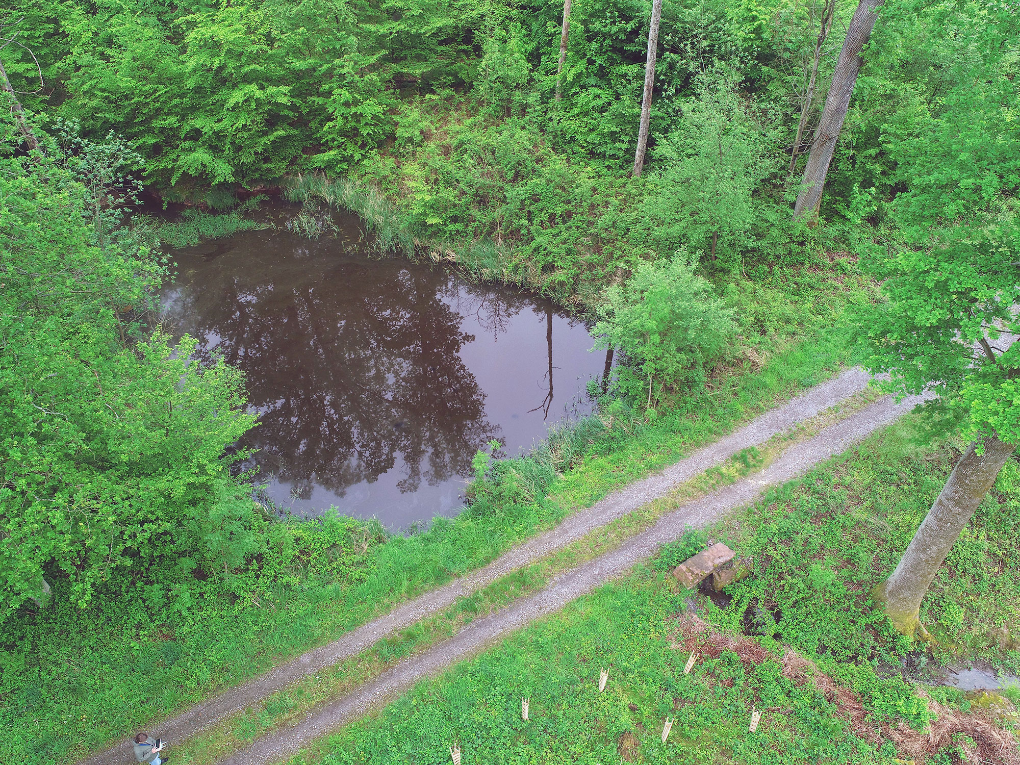 Kleinrückhalte an Wegen können wertvolle Habitate für wassergebundene Arten bieten, verbessern das Kleinklima im Wald und können durch ihre kühlende und befeuchtende Wirkung Hitzephasen abmildern. Ihr direkter Einfluss auf die Bodenfeuchte im angrenzenden Waldbestand ist aber gering.