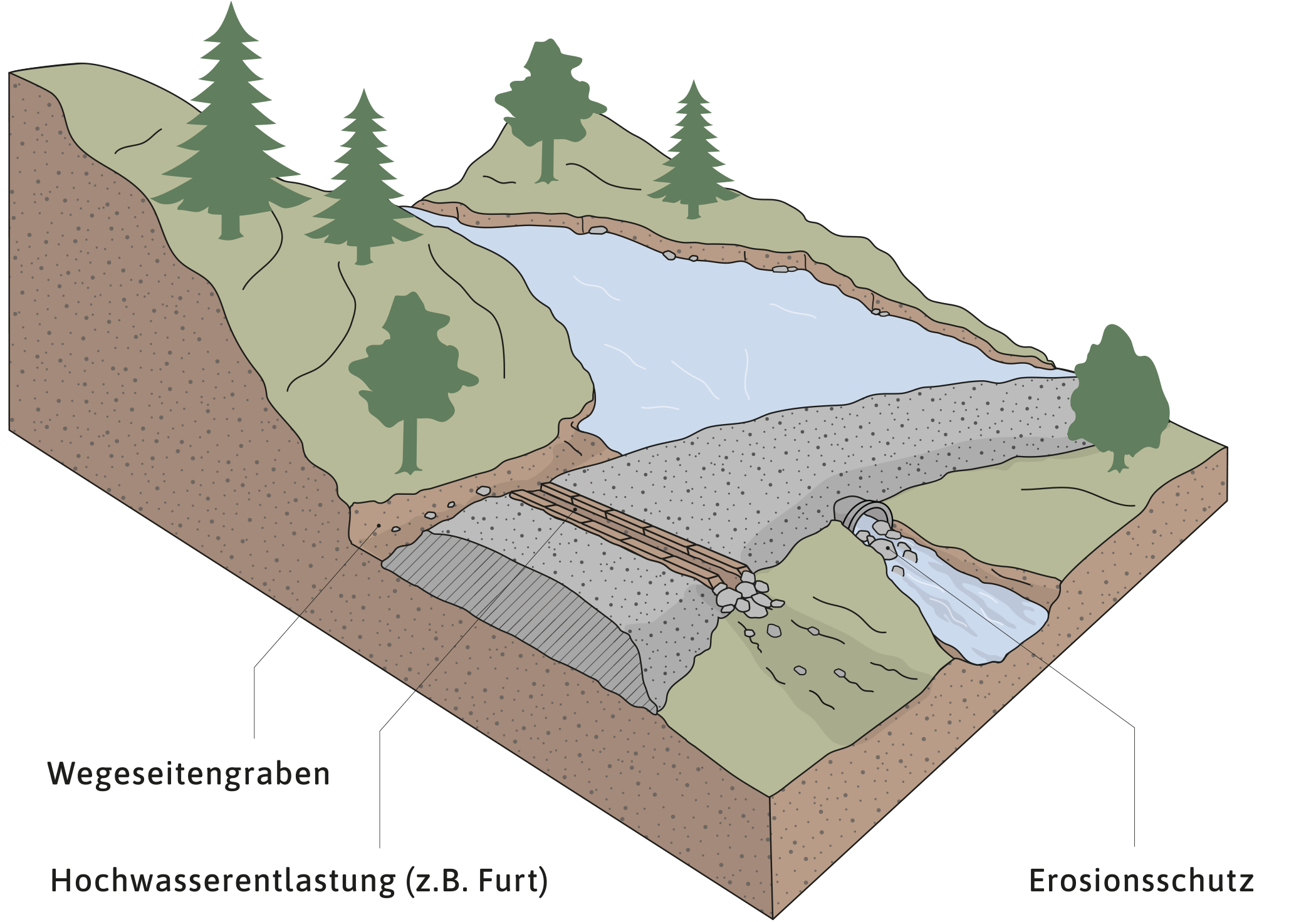 Eine Hochwasserentlastungsanlage, z.B. eine Furt, eine Rigole oder ein zweiter, knapp unterhalb des Vollstauniveaus platzierter Durchlass, gewährleistet die Standsicherheit des Forstweges bei besonders starken Abflussereignissen. Zudem ist darauf zu achten, dass nach Leerlaufen im tiefsten Punkt eine Restwasserfläche als Rückzugsort für Tiere und Pflanzen erhalten bleibt.