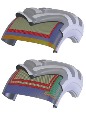 Bei Forstreifen bestehen auch Unterschiede zwischen Diagonal- und Radialreifen (Abb. 2). Weil beim Diagonalreifen die Lauffläche und die Flanke eine feste Einheit bilden, sinkt die mögliche Einfederung der Reifen; das heißt die Reifen sind steifer und passen sich nicht immer optimal an die Bodenoberfläche an. Mittels der Verwendung von Radialreifen wird der Bodendruck verringert, die Traktion verbessert und der Komfort erhöht. Allerdings müssen in den Radialreifen Flankenschutzeinlagen eingearbeitet werden, damit dieser der Belastung im Forst, vor allem möglichen Durchstichen von Ästen, standhält.