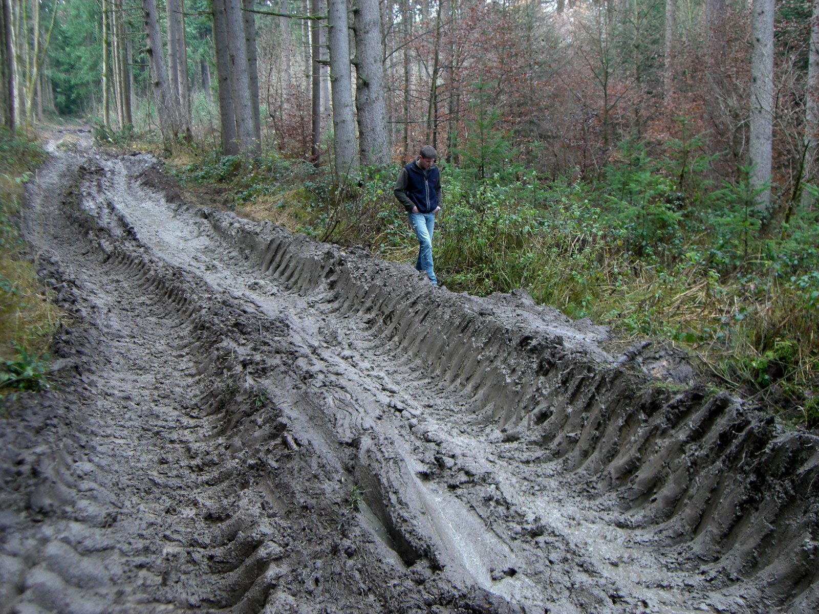 Bei der Tragfähigkeit und Befahrbarkeit der Böden spielen zahlreiche verschiedene Faktoren eine Rolle, wie z.B. der Wassergehalt, die allerdings vom Menschen nicht beeinflussbar sind. Forstmann / -frau kann lediglich auf die äußeren Umstände reagieren und den Einsatz im schlimmsten Fall verschieben. Verändern kann man dagegen die technische Ausstattung der eingesetzten Maschinen. Je höher die Radanzahl der eingesetzten Fahrzeuge ist, desto geringer ist die Radlast, desto weniger Druck kommt auf den Waldboden, da sich dieser besser verteilt. Eine ebenso große Rolle spielt die Beschaffenheit der Reifen. Je höher die Reifenbreite, desto besser ist die Druckverteilung.