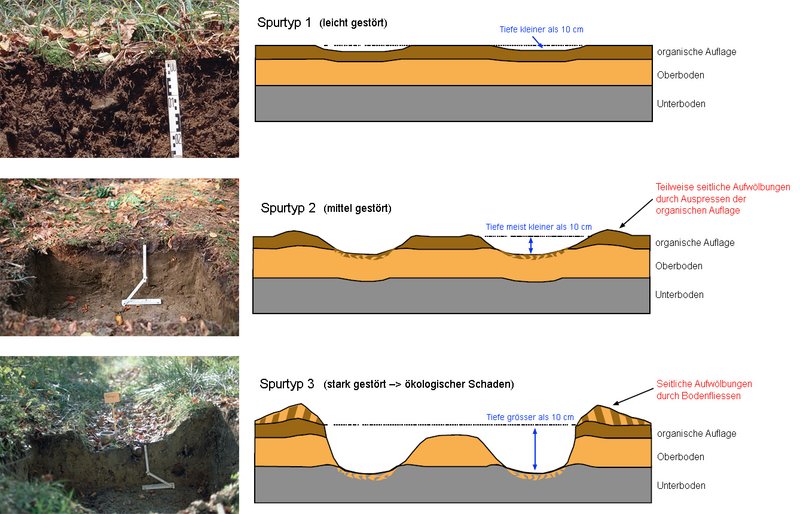 Es wurden Spurtypen definiert, die im Einklang mit Richt- und Prüfwerten (VBBo, 1998) stehen und dadurch das Ausmass der Beeinträchtigung bzw. Schädigung differenziert zum Ausdruck bringen. Diese Werte betreffen die effektive Lagerungsdichte des Bodens, das Grobporenvolumen, die gesättigte Wasserleitfähigkeit sowie den Eindringwiderstand (BGS, 2004). Die an der Bodenoberfläche erkennbaren Spuren hinterlassen oft Beeinträchtigungen bis in den Unterboden (Abb. 3).