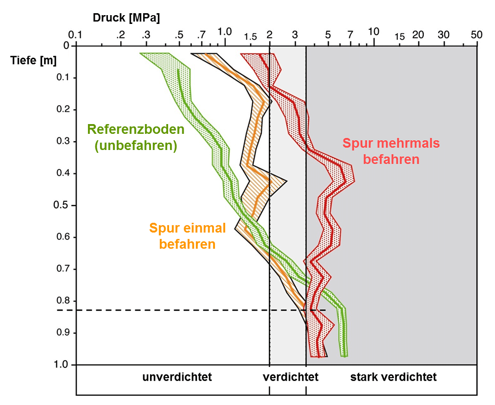 Der unbefahrenen Referenzmessung bis in eine Tiefe von 100 cm werden die Resultate einer einmaligen Befahrung mit einem Vollernter unter guten Voraussetzungen, d.h. bei geringer Bodenfeuchte und einer Spur mit mehrmaliger Befahrung bei unterschiedlichen Feuchtezuständen (Räumungsarbeiten nach dem Orkan Lothar), gegenüber gestellt. Deutlich ist zu erkennen, dass die Eindringwiderstände erst in einer Tiefe ab 55 cm bzw. ab 75 cm wieder mit der Referenzkurve zusammentreffen.