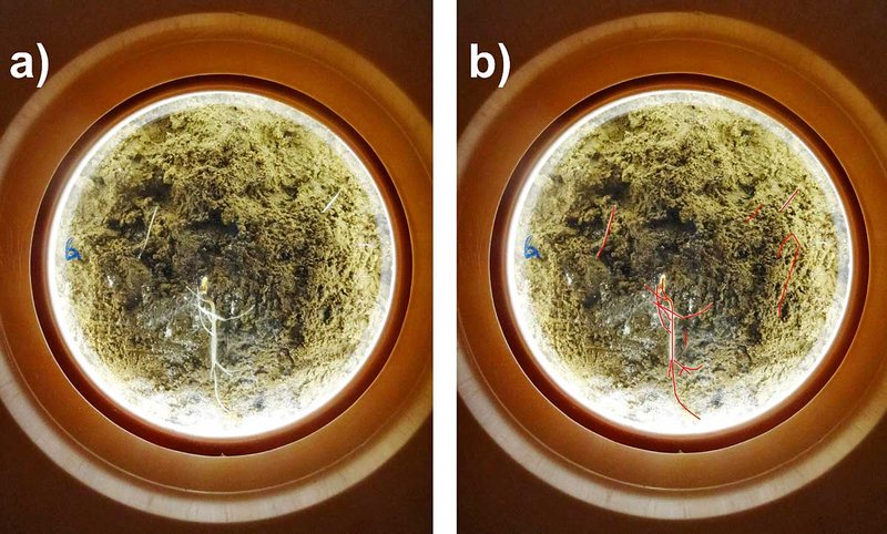- Das Wurzelwachstum wurde direkt im Boden erhoben. Hierfür wurden 16 Rhizotronkammern in 25 cm Tiefe installiert. So konnte monatlich eine Aufnahme der Durchwurzelung mittels Digitalkamera quasi in situ gewonnen werden.