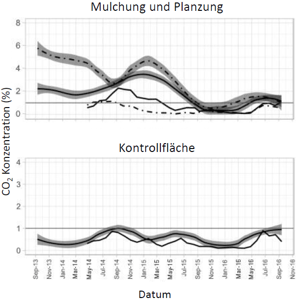 Abb. 5: CO2-Konzentrationen hinter Rhizotronscheiben (nicht-schattierten Linien) und in korrespondierenden Gassammlern in 25cm Tiefe (schattierten grauen Linien mit 95%-Vertrauensintervallen) für die gemulchte und bepflanzte Fläche sowie die nicht befahrene Kontrollfläche. Nach zwei Jahren ist bereits eine deutliche Reduktion des CO2 eingetreten, was auf verbesserte Belüftungsbedingungen hinweist.