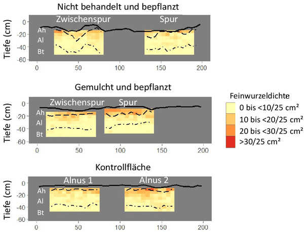 Seit 2014 wird das Wurzelwachstum der Erlen durch die Rhizotronkammern fotografiert (Abb. 6). Wie erwartet, wurde das höchste Wurzelwachstum in der nicht verdichteten Kontrollfläche gefunden. Für die behandelten, verdichteten Flächen wurde das höchste Wachstum auf der gemulchten Variante beobachtet und das niedrigste Wachstum auf der gemulchten und nicht bepflanzten Variante.