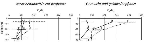 Neben der Zunahme der Feinwurzeldichten sowie den reduzierten CO2-Werten im Boden deuten auch die im Labor bestimmten Gasdiffusionswerte auf eine Regeneration hin. Während auf der nicht behandelten und unbepflanzten Fläche keine signifikante Verbesserung der Gasdiffusionswerte verzeichnet wurde, ist auf den behandelten Flächen eine zum Teil signifikante Verbesserung der Porenstruktur und damit der Diffusionswerte festgestellt worden (Abb. 8).