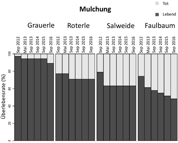 Abb. 4: Überlebensraten (in %) für die Baumarten auf den gemulchten Flächen zwischen September 2012 und September 2016.