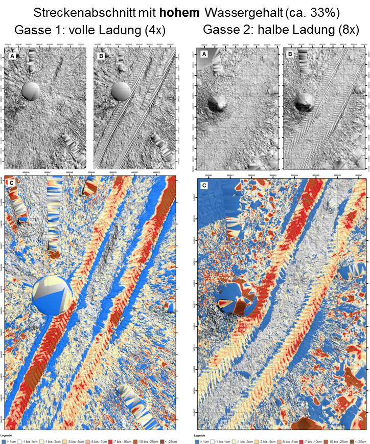 In den Abschnitten mit niedrigem Wassergehalt (ca. 25%) liess sich bei der Spurbildung praktisch kein Unterschied zwischen dem Befahren mit voller und mit halber Ladung feststellen. In den Abschnitten mit hohem Wassergehalt (33%, nahe der Fliessgrenze) war die Spurbildung bei halber Ladung tendenziell etwas geringer, die Fallstudie erlaubt jedoch diesbezüglich keine gesicherte Aussage.