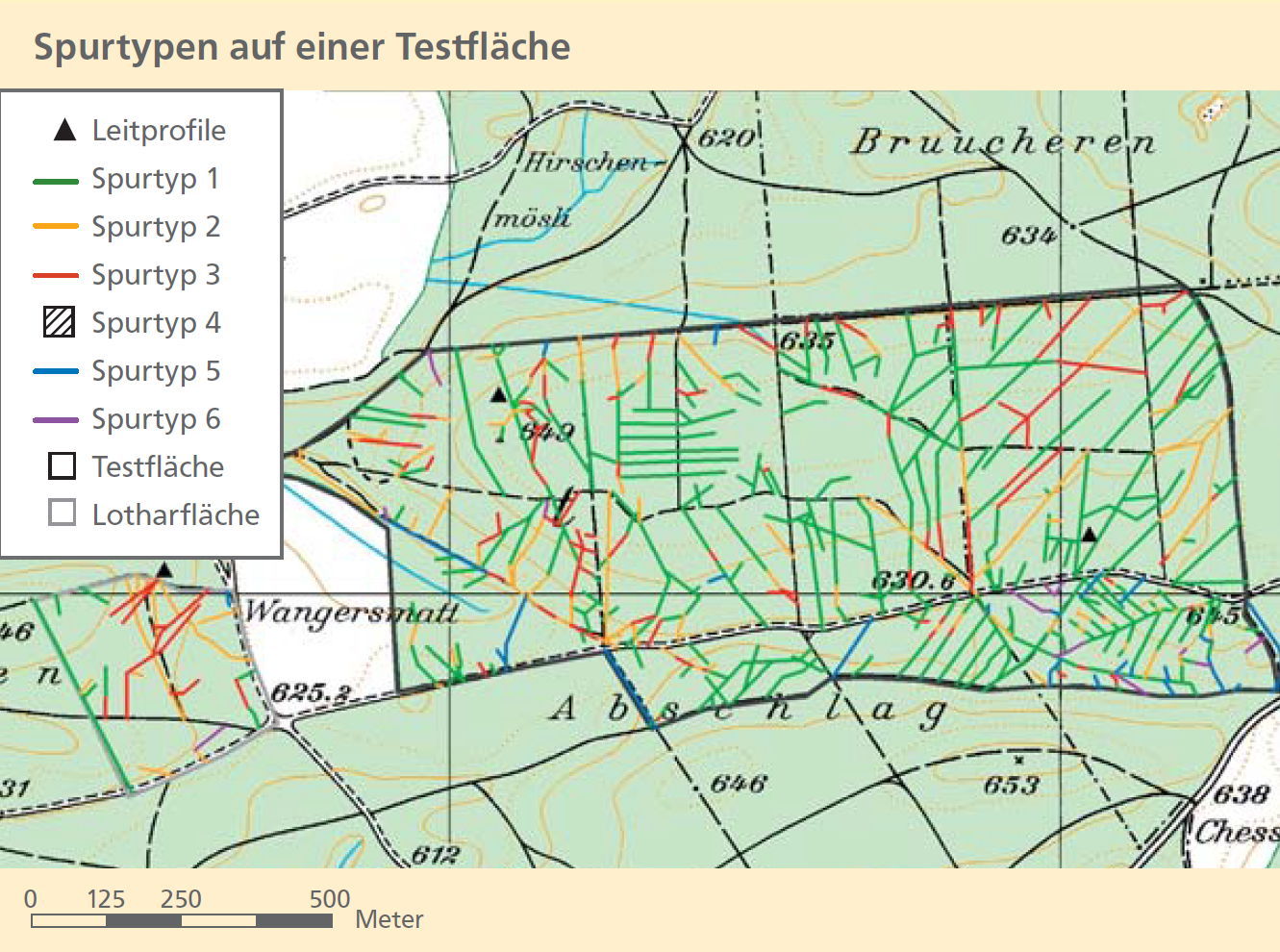 In unterschiedlichen Regionen des Schweizerischen Mittellandes wurden auf Testflächen im befahrbaren Gelände alle noch erkennbaren Fahrlinien kartiert, um einen Einblick in die heutige Situation der Fahrliniendichte und Spurtypenanteile zu erhalten. Kartiert wird wie erwähnt auf der Grundlage einer eigens entwickelten Fahrspurtypisierung.