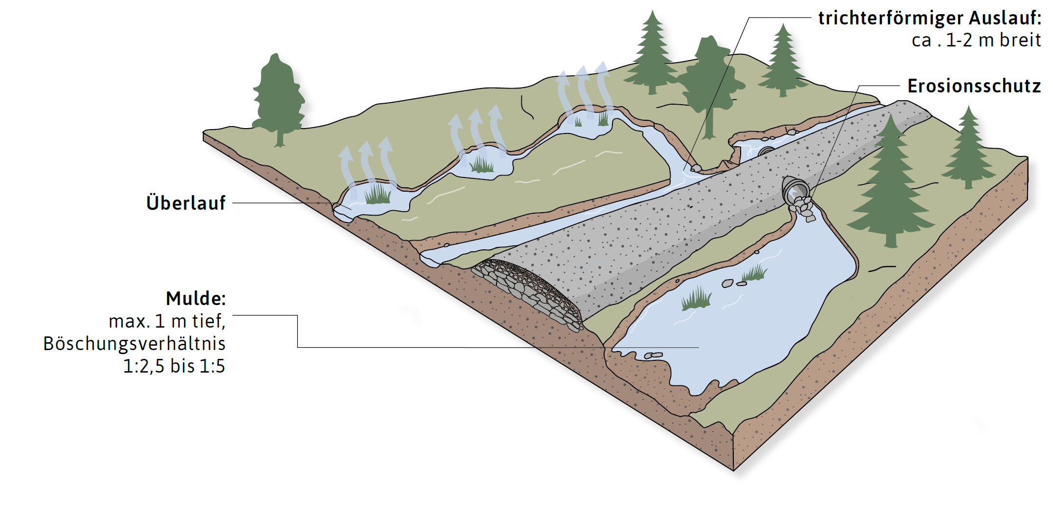 Verdunstungsmulden nehmen Wasser aus Wegen und Wegeseitengräben auf und schaffen damit einen Zwischenspeicher, der Abflussspitzen verzögert und dämpft.