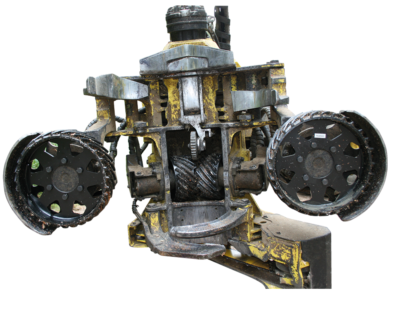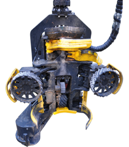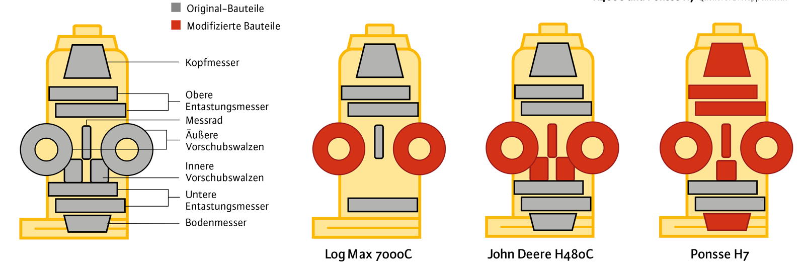 Für die Entwicklung mitteleuropäischer Debarking Heads wurden konventionell eingesetzte Fällköpfe umgebaut und das Ernteverfahren modifiziert. Eine Marktanalyse und die Kontaktaufnahme mit Forstmaschinen-Herstellern ergab drei Aggregate, mit denen eine Reihe von Versuchen durchgeführt werden konnten. Dabei handelt es sich um die Aggregate John Deere H480C, Log Max 7000C und Ponsse H7 (Abbildungen 2 und 3).