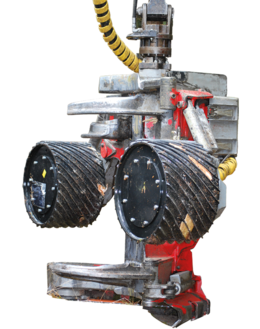 Die Kosten für die Umrüstung vom konventionellen zum entrindenden Aggregat variieren je nach Umfang (Abbildung 3) und Zeitaufwand der Umbaumaßnahmen. Um eine ausreichende Entrindung des Stammes zu erreichen, muss dieser, anders als bei der konventionellen Holzernte, mehrfach durch das Aggregat gelassen werden. Die reine Aufarbeitungszeit eines Stammes nahm bei den Versuchen um etwa ein Drittel zu. Die Gesamtarbeitsleistung des Harvesters (Fm/MAS) verringert sich dadurch um etwa 10 %. In den Versuchen, die in Fichten bzw. Kiefern dominierten Beständen stattfanden, stiegen die Gesamtkosten der Holzerntemaßnahme um bis zu 5 €/Fm, dabei wurden weitere Kostenfaktoren wie die Investitionskosten für die Umrüstsätze, die Standzeiten für die Umbauten am Aggregat und die Minderleistung während der Einarbeitungszeit des Maschinenführers nicht berücksichtigt.