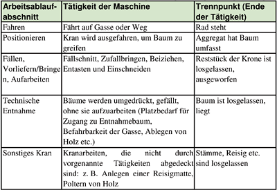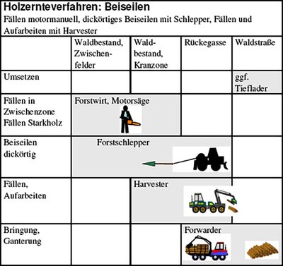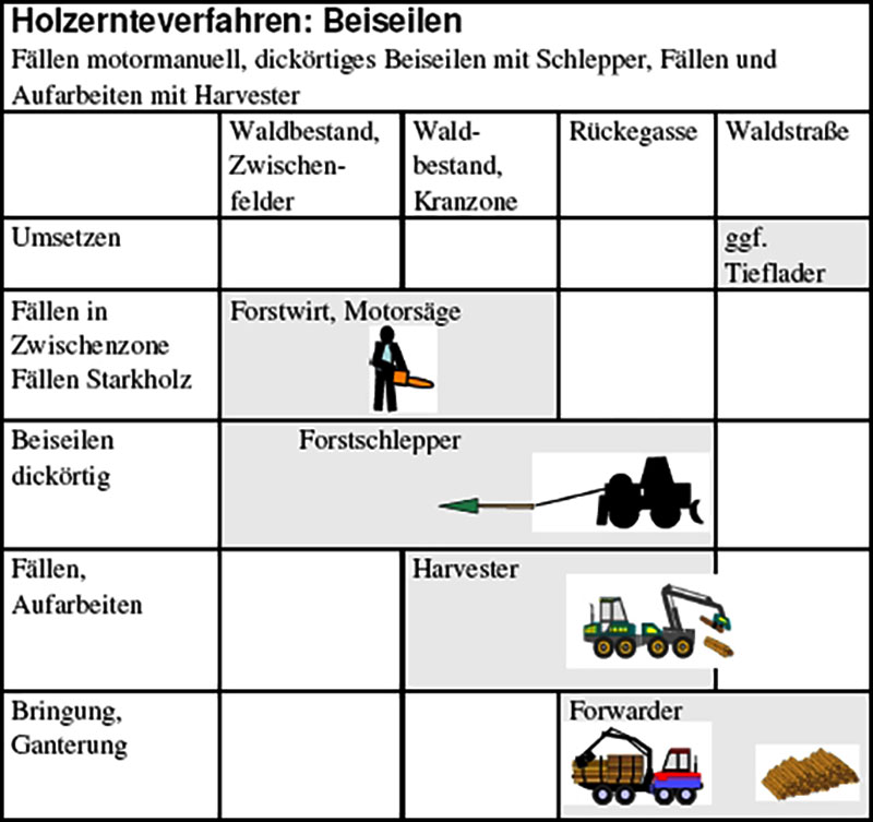 Dazu gehören die Reihenfolge und der Ort der einzelnen Teilarbeiten, Betriebsmittel, Organisatorisches und nicht zuletzt die Ausbildung und Erfahrung der Arbeitskräfte. Wichtige Details können durch genaues Hinsehen und vor allem über das direkte Gespräch mit Einsatzleitern, Forstwirten und Maschinenführern geklärt werden. Ein Beispiel für die grafische Verfahrensbeschreibung ist die Matrixform, die auch in den KWF-Tagungsführern regelmäßig verwendet wird (Tab. 1).