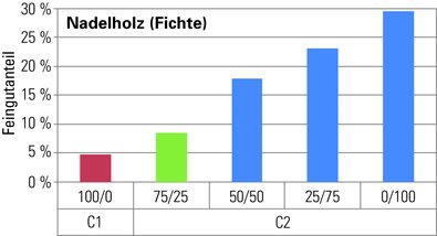 Von besonderem Interesse war der Einfluss des Ast- und Nadelanteiles am Rohmaterial auf die Hackgutqualität (Abbildungen 2 und 3). Die Produktionsversuche bei Nadelholz ergaben: Je höher der Anteil an grünem Astmaterial, desto deutlicher steigt der Feinkornanteil. Vergleichbare Ergebnisse brachten die gesammelten Proben mit ähnlicher Zusammensetzung des Ausgangsmaterials.