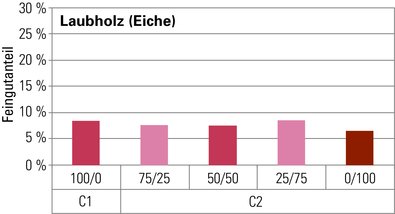 Bei den Versuchshackungen mit Laubrundholz (Eiche, Hainbuche) verschiedener Lagerdauer von sechs bis 13 Monaten konnte kein signifikanter Einfluss der Lagerdauer auf den Feinkornanteil festgestellt werden.