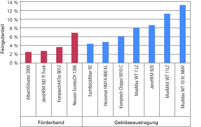 Aber auch innerhalb der beiden Gruppen waren deutliche Unterschiede im Feingutanteil festzu-stellen (Abbildung 5). Da nur Trommelhacker verglichen wurden, kommen nur folgende Faktoren als Ursache in Frage: die Messeranordnung, die Messergüte, die Messereinstellung, die Drehzahl der Trommel sowie der Vorschub und die Nachzerkleinerung.