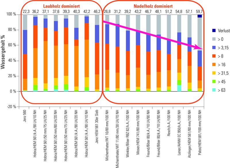 Abbildung 4: Korngrößenverteilung der gezogenen Proben aus Laub- und Nadel-Schlagrestholz nach ÖNORM EN 14961-1, sortiert nach Wassergehalt Quelle: BFW und HFA