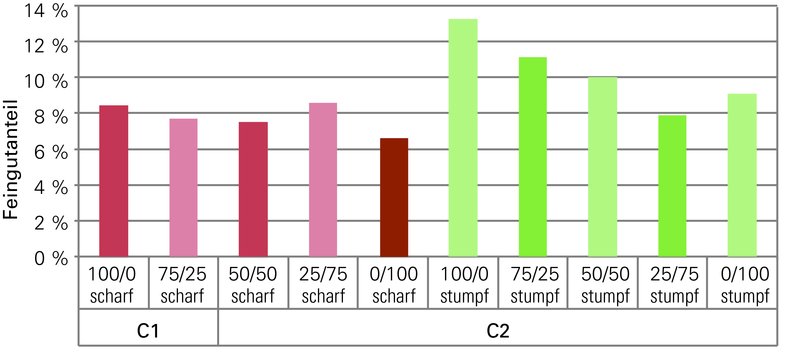 Beim Hacken von Eichenästen mit etwa 50% Derbholzanteil und leichter Verschmutzung hat bereits die binnen sechs Stunden Hackzeit erfolgte Abnützung der Messer zu einer deutlichen Erhöhung des Feingutanteiles geführt (Abbildung 6).