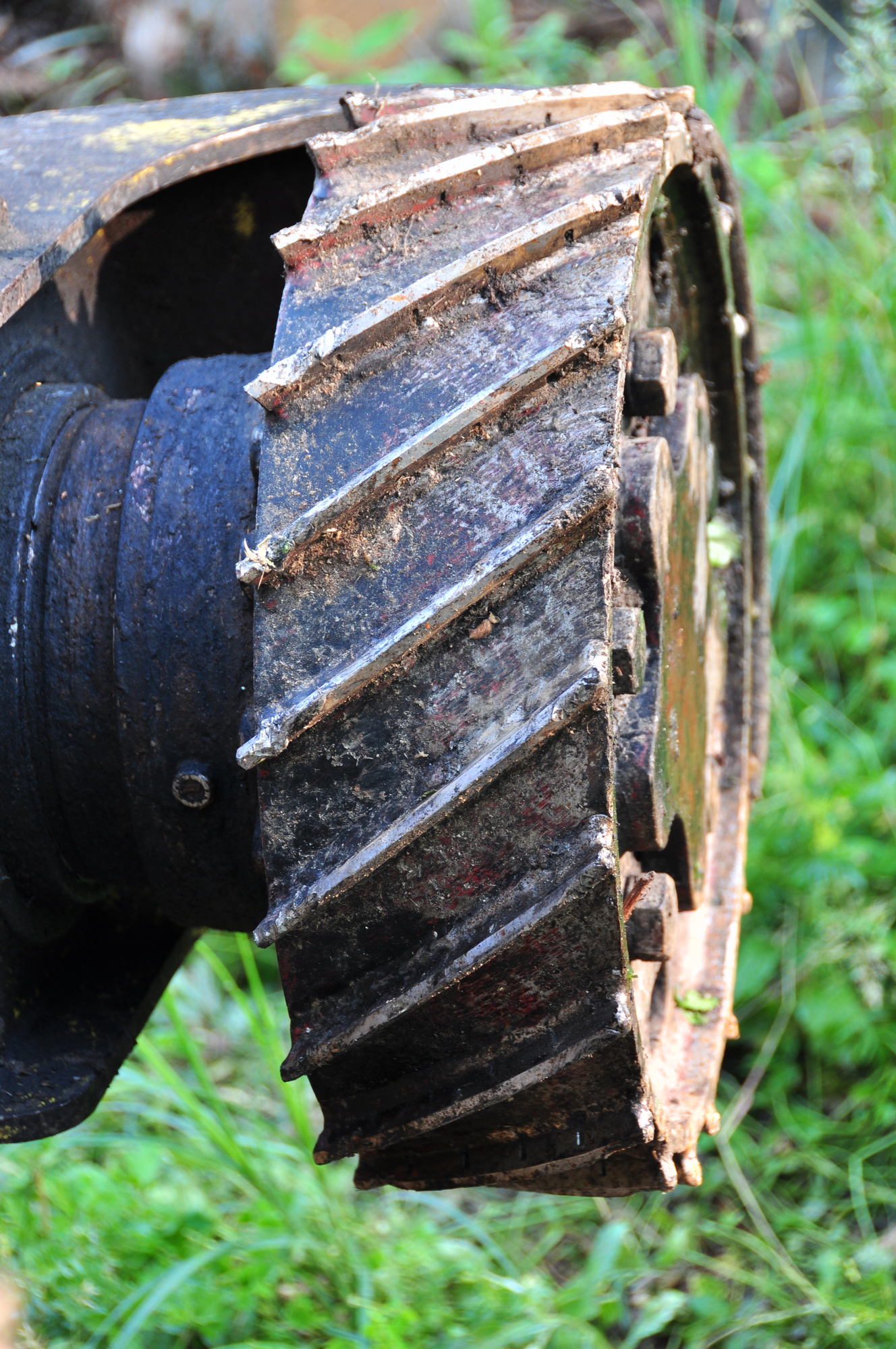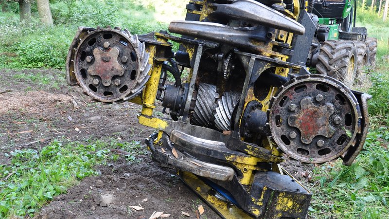 Umgerüstetes Harvesteraggregat H415 von John Deere. Die außen- und innenliegenden konventionellen Walzen wurden gegen Spezialwalzen getauscht.