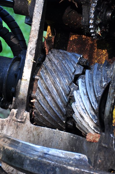 Innenliegende Walzen mit schräg verlaufenden Stegen.