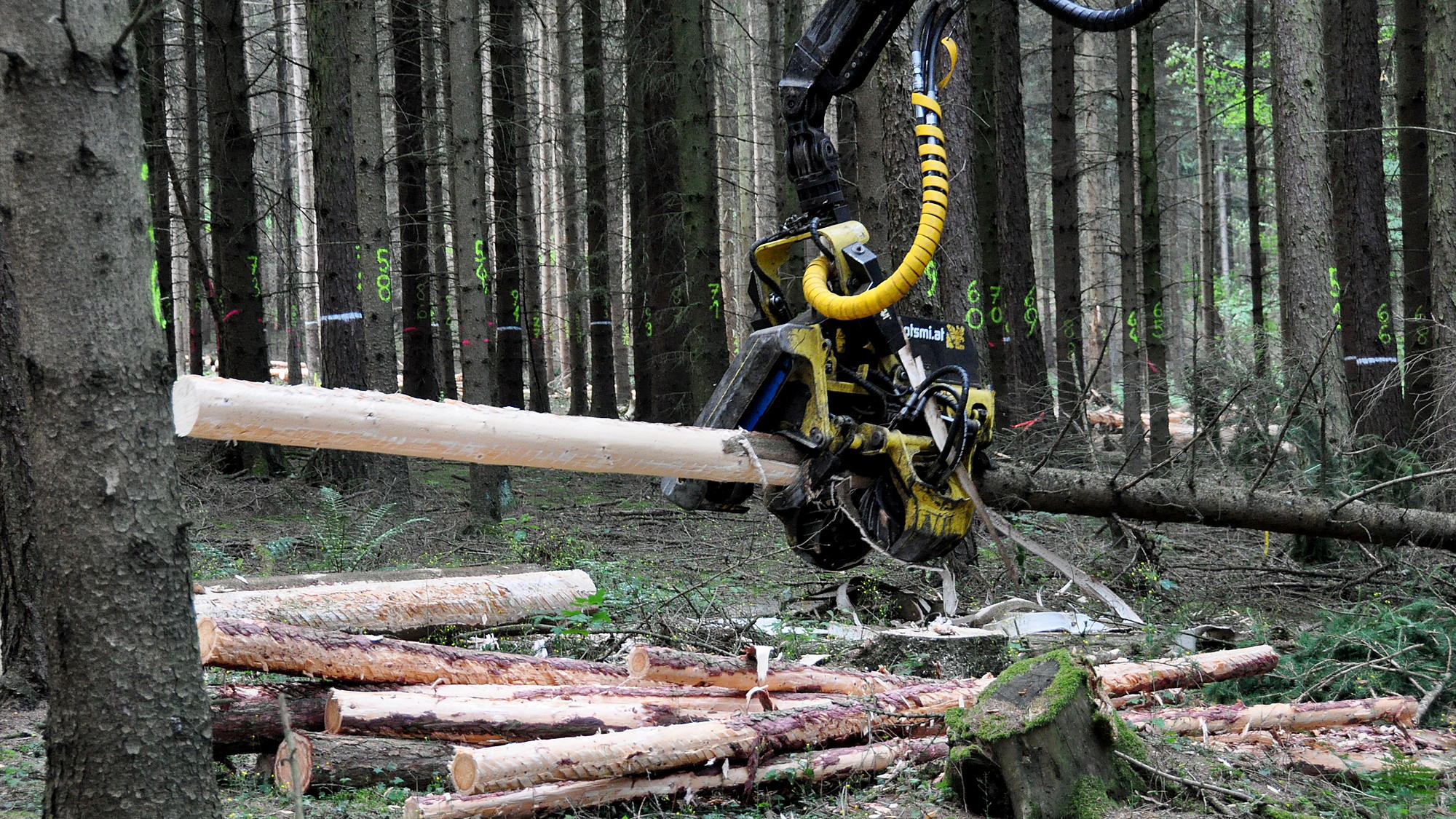 H415-Harvesteraggregat von John Deere beim Entrinden und Ausformen von Sortimenten im Versuchsbestand.