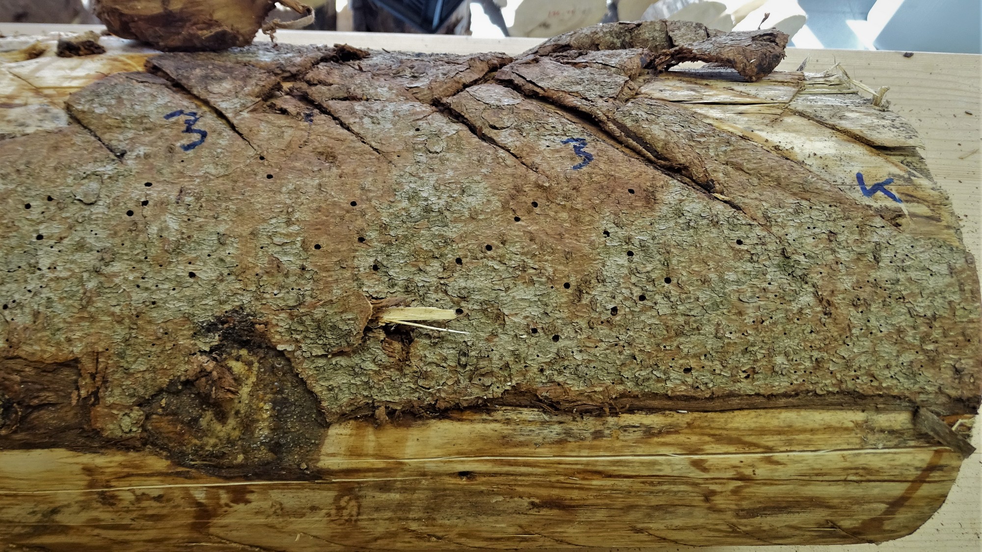 Ein hoher Entrindungsgrad konnte bei den diesjährigen Folgeversuchen erzielt werden, jedoch mit einer anderen Maschine und Arbeitstechnik. Hierbei wurde vor dem Ablängen der gesamte Stamm in mehreren Durchläufen des Aggregates entrindet und erst dann die jeweiligen Sortimente ausgeformt, ähnlich dem Verfahren vom KWF. Die Käfer befanden sich hier bereits in einem späteren Entwicklungsstadium. Bei der anschließenden Analyse der Sortimente waren fast keine Probestücke mit nennenswertem Rindenanteil für Detailuntersuchungen zu finden. Hier gilt es noch abzuklären, in welchem Ausmaß die bereits fertigen Käfer den Entrindungsvorgang unbeschadet überleben und dadurch ausfliegen konnten. Im Vergleich zu den Kontrollstücken schlüpften aus den geworbenen Rindenproben weniger Käfer. Endgültige Projektergebnisse zu den Versuchen werden voraussichtlich mit Ende dieses Jahres vorliegen.