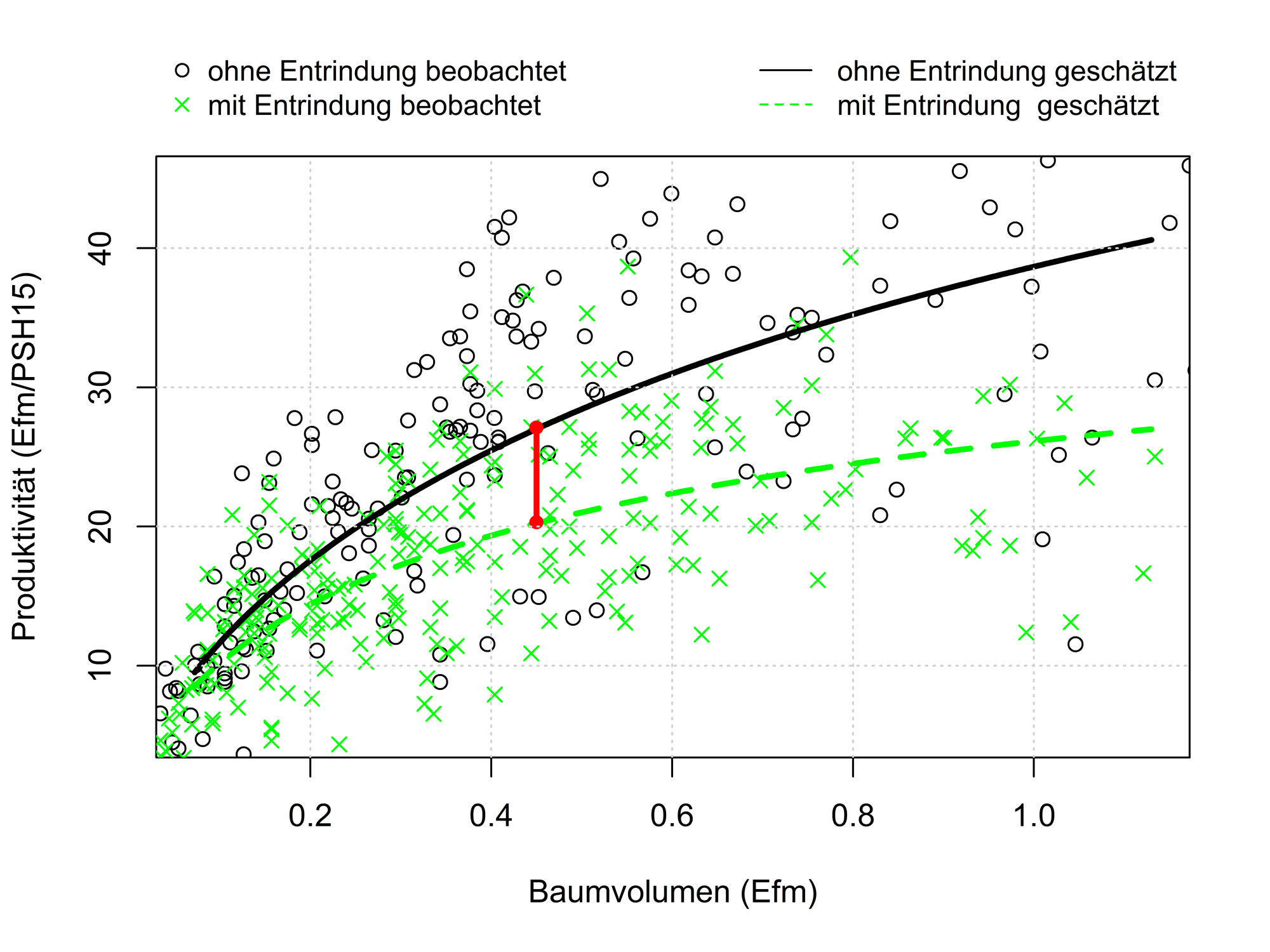 Beobachtete und geschätzte Produktivität mit (grün) oder ohne (schwarz) integrierter Entrindung in Abhängigkeit vom geernteten Baumvolumen inklusive Produktivitätsunterschied beim mittleren Baumvolumen.