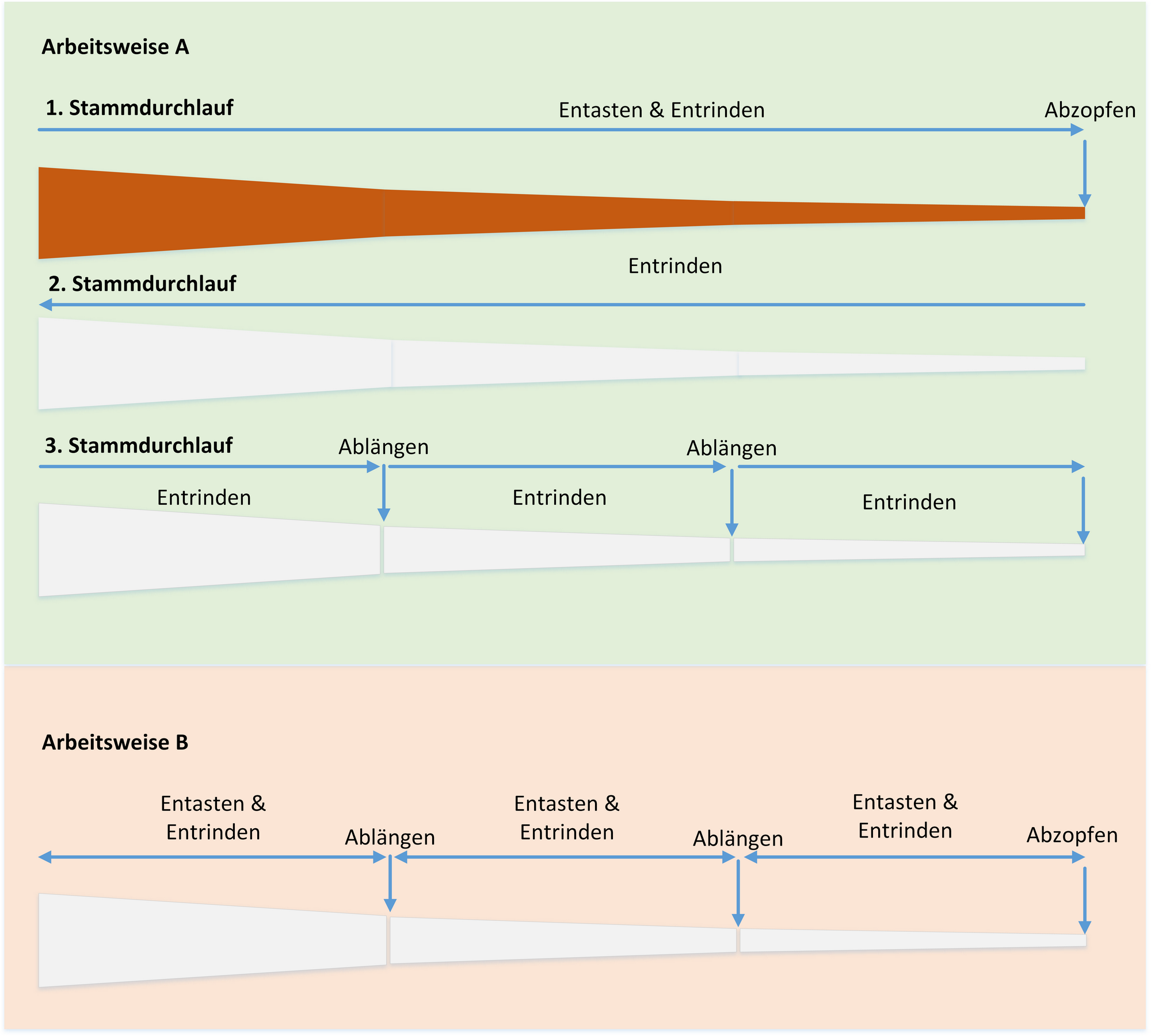 Angewandte Arbeitsweise bei der Entrindung mit Harvester im Bestand bei den Versuchen in Deutschland in drei Schritten (A) und jene mit gleichzeitiger Entrindung ohne Umgreifen beim Versuch in Österreich (B).