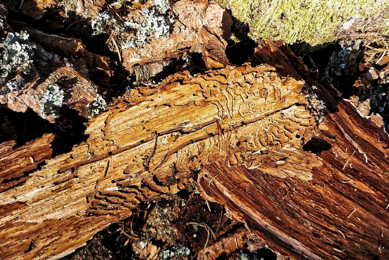 Rindenstück mit stark abgetrockneten Einschnitten durch die Walzenstege am Rand ohne Ausbohrlöcher, hingegen in der Mitte mit zahlreichen Ausbohrlöchern von Buchdrucker und Kupferstecher.