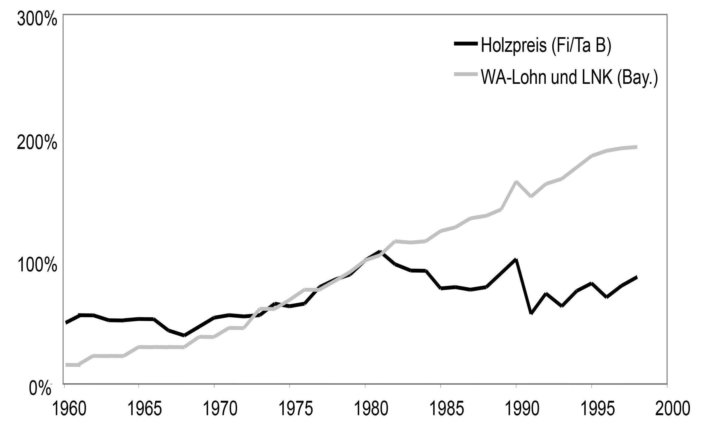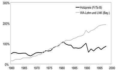 Fast der gesamte Einschlag wird motormanuell aufgearbeitet (86 %, Abb. 5). Etwa 80 % des Holzes wird mit landwirtschaftlichen Schleppern bzw. Unimog gerückt (die Zahl der Pferde verringerte sich von 1960 bis 1965 von 1 Mio. auf 0,4 Mio., dagegen nahm die Schlepperzahl von 0,5 Mio. auf 1 Mio. zu). Schäden am Boden werden nicht wahrgenommen, allenfalls Schäden an der Verjüngung. Die Erlöse steigen, die Kosten steigen moderat. Die Gesellschaft interessiert sich vor allem für das Produkt Holz und die bereitgestellten Arbeitsplätze, nicht aber für die Art des Wirtschaftens. Durch die Verdichtung des Forststraßennetzes kann mehr Holz beigeseilt werden (Aufkommen von Seilwinden), andererseits befahren nach der fast vollkommenen Verdrängung der tierischen Rückung zunehmend Schlepper nicht erschlossene Bestandesflächen. Neue Sortimente (IL) kommen wegen der waldbaulichen Umstellung auf Hochdurchforstung auf, die in langer Form ausgehalten werden und deshalb mit Schlepper gebracht werden müssen.