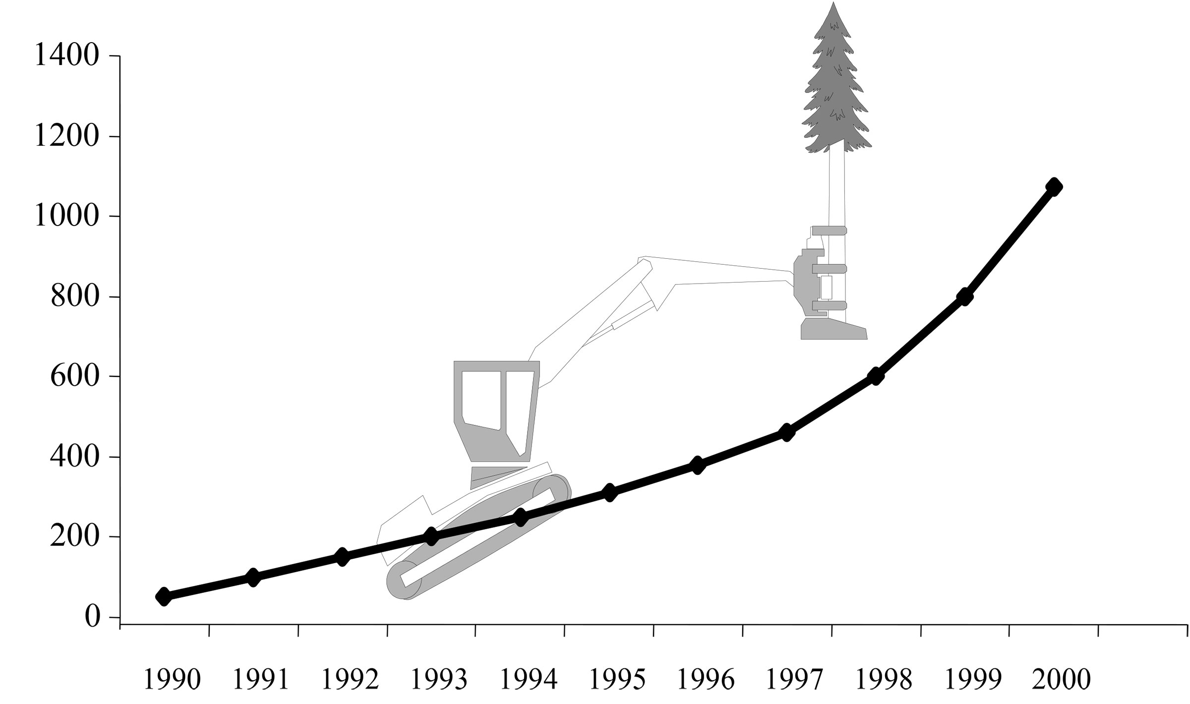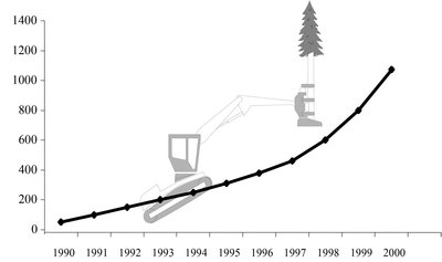 Der Harvester hat sich in Folge der Sturmwurfaufarbeitung von "Vivian" und "Wiebke" durchgesetzt, der Anteil am aufgearbeiteten Volumen beträgt rund 10 %. Die Förster sind gegenüber Bodenschäden sensibilisiert. Abbaubare Schmierstoffe und Hydraulikflüssigkeiten kommen auf. Die Zertifizierungsdiskussion beginnt. Ökologisches Wirtschaften soll über Ökolabels kenntlich gemacht und über den Preis für Produkte belohnt werden. Reifendruckregelanlagen kommen erstmals auf, Niederquerschnittsreifen werden Standard, der Trend geht zu größeren Maschinen. Die Holzpreise sinken infolge der Sturmwürfe "Vivian" und "Wiebke".