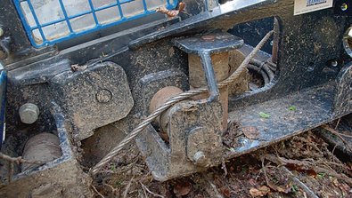 Dann bekam die nackte Grundmaschine zum Antrieb der Seilwinden eine Frontzapfwelle, angetrieben direkt von der Kurbelwelle aus. Entsprechende "Kits" sind auf dem Markt verfügbar. Die nächste Etappe bestand darin, das Chassis vollständig in eine 25 mm dicke Stahlwanne einzupacken. Man kann sich vorstellen, wie viel Plasmaschneiden, Winkelschleiferei und Schweissen dazu nötig war. Aber ohne diese Verstärkungen – das wusste Martin Bühler – wäre das Fahrzeug den forstlichen Strapazen kaum gewachsen gewesen. Tatsächlich trägt das mit Streben verstärkte Stahlkorsett vorne die Seilwinden und hinten das Rückeschild und nimmt damit den grössten Teil der im Betrieb auftretenden Kräfte und Schläge auf.