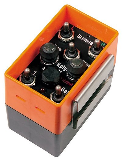 Abb. 4. Funksender: Wichtig sind robuste Bedienelemente, die auch mit Arbeitshandschuhen sicher zu betätigen sind. Getragen wird der Sender vor der Brust oder seitlich am Gürtel. Er soll immer zur Hand sein, aber nie im Weg! Foto: Beat Aerni