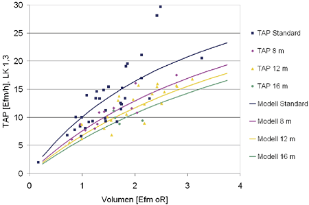Die Produktivität des normalen Zufällens lag beim Versuchsmittelstamm mit einem Volumen von 1,5 Efm o.R. bei 13,5 Efm/h. Die Produktivität des KHV erreichte zwischen 8,5 und 10,5 Efm/h je nach Länge (hier zwischen 8 und 16 Metern) der Erdstammstücke.