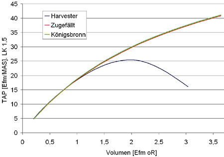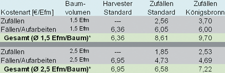 Zu Grunde liegt ein Stammvolumen von 1,5 Erntefestmetern und eine abgetrennte Länge von 12 Metern beim Königsbronner Harvesterverfahren. Diese Länge entspricht der im Versuch am häufigsten verwendeten. Die Mehrkosten des KHV gegenüber dem Standard-Zufällen beliefen sich in der Fallstudie auf knapp 50 Cent pro abgetrenntem Sortenstück. Ab einem Baumvolumen von 2,5 Efm o.R. ist das Standard-Zufällverfahren, ab 2,6 Efm o.R. auch das KHV günstiger als das reine Harvesterverfahren.