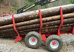 Durch die gute Lenkgeometrie des mit einem doppelt wirkenden Zylinder gelenkten Anhängers konnten wir bequem in die rechtwinkelig zur Straße angelegte Rückegasse einfahren. Die heruntergeklappten Standflächen des Kranführerstandes haben allerdings den Einschlag etwas behindert. Der Pendelweg der Bogieachsen ist mit 310 mm gut. Es fehlt aber ein wirksamer Begrenzungsanschlag.