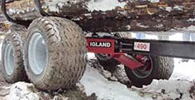 In den glatten dicken Stahlplatten und kufenförmig ausgebildeten Schwingachsen an der Unterseite des Anhängers spiegelt sich die Erfahrung mit den Umständen im Wald wider. Igland zieht die Stützbeine des Kranes ordentlich ein, so dass sie nur wenige cm tiefer als die Bodenplatte liegen. Dadurch war auch die "Buckelpistenfahrt" kein Problem. Ohne Ladeflächenverlängerung kann der Anhänger in Rückwärtsfahrt Böschungen mit einem realitätsnahen Verhältnis von nahezu 1:1,5 (61 %) überfahren.