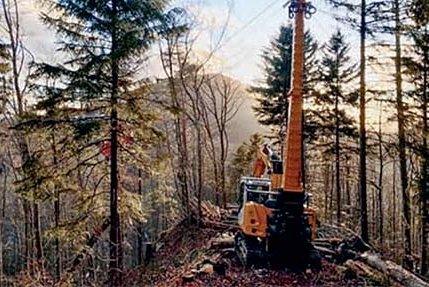 Abb. 1. Der Yarder Grizzly 400 (links) bei der Bergaufbringung. Wie bei herkömmlichen Seilkränen wird das Holz meist mit einer zweiten Maschine auf dem Holzplatz verarbeitet. Der Mast lässt sich mit Hilfe des Baggerarms auf fast jedem Untergrund aufstellen.