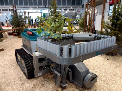 Die Firma Pfanzelt aus Rettenbach am Auerberg entwickelt ihre Forstraupe "Moritz" immer mehr zu einem Geräteträger. Auf der Interforst stellte sie ein Pflanzaggregat für Containerpflanzen vor, das über eine hydraulisch angetriebene Frässcheibe verfügt. Diese Frässcheibe bereitet den Untergrund für die Pflanzung vor und soll den Mineralbodenanschluss sicherstellen.