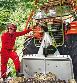 Durch die hoch angesetzte untere Umlenkrolle kommt es beim schrägen Zuzug zu seitlicher Instabilität. Die Winde wird einseitig angehoben. Die Ausführung der unteren Umlenkrolle zeichnet sich durch einen großen Rollendurchmesser aus. Durch das einfache Öffnen der Umlenkrolle lässt sich das Seil einfach einlegen (Abbildung rechts). Der vorhandene seitliche Platz vor dem Rückeschild ist gut genützt. In den abgedeckten Ablagefächern ist Platz für jede Menge Zubehör. Das Einfädeln des Zugseiles und dessen Befestigung ist mühelos durchführbar.