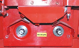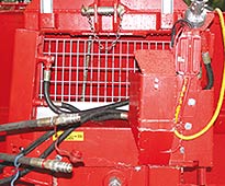 Die hohe und breite Ausführung des Rückeschildes schützt den Traktor vor nachrutschendem Holz. Die Sicht zur Last und zum Seilende ist dadurch leider kaum mehr gegeben. Die Form des Rückeschildes zeigte sich im praktischen Test als zweckmäßig, wenngleich die seitlichen Schildkanten immer wieder zu Holzverletzungen führen. Das Einlegen des Seiles in die untere Umlenkrolle ist durch eine seitliche Öffnung einfach. Der Anhängepunkt der Unterlenker an der Winde liegt mit 51 cm hoch.