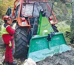 Die Positionierung der unteren Seileinlaufrolle kann beim Poltern hinderlich sein. Die Form des Polterschildes ist vorteilhaft, vor allem bei engen Lagerverhältnissen durch die Schrägstellung der seitlichen Rückeschildkante. Die extrem ausgeführten Ecken führen immer wieder zu Verletzungen des Holzes beim Lagern.