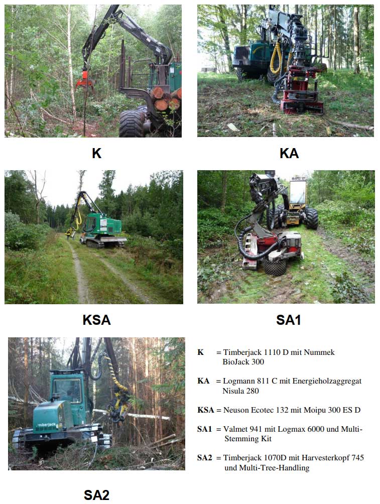 Zum Einsatz kamen fünf Maschinentypen mit unterschiedlichen Fäll- und Vorliefertechniken. Mit Ausnahme einer Maschine mit einem reinen Zwickeraggregat ("Kneifer", "Messer") waren die restlichen Aggregate alle mit einer Sammeleinheit ausgestattet. Mit ihr konnten schwächere Bäume kurz nacheinander gefällt, gesammelt und als Bündel abgelegt werden. Jede Maschine hat spezifische Vorteile in Bezug auf eine Schwachholzernte. Die Zwicktechnik erlaubt das problemlose Abtrennen sehr dünner Stämme auch bei buschartigem Aufwuchs. Ideal sind Flächen mit einem Bestandesmitteldurchmesser bis einschließlich 10 cm. Mit den Sägeaggregaten besteht in zu dünnen Beständen ein erhöhtes Risiko eines Abspringens der Kette. Ihr Einsatz ist in Jungbeständen ab 10 cm von Vorteil. Die Maschine "KSA" ist besonders flexibel. Sie vereint beide Fälltechniken in einem Aggregat.