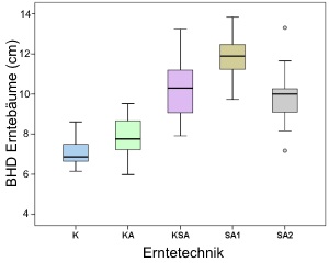 Abb. 3: Mittlere Bestandesdurchmesser ("entnommener Bestand") in 91 beernteten Versuchsplots