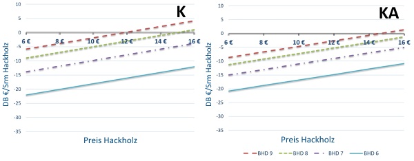 Mit den Zwickeraggregaten und einer reinen Hackholzproduktion kann nur in den wenigsten Fällen kostendeckend gearbeitet werden. Dazu muss der Holzpreis überdurchschnittlich hohe Werte erreichen und die Erntebäume sollten im Durchschnitt nicht zu dünn sein. Bei der Maschine "K" lag die Gewinnschwelle bei einem Durchmesser des entnommenen Bestandes von 9 cm zwischen bei 12 €/Srm, bei der Maschine "KA" bei ca. 14 €/Srm. Dafür sind relativ hohe Erntebaumzahlen nötig. Bei zu geringen Erntebaumzahlen erhöht sich die Gewinnschwelle.