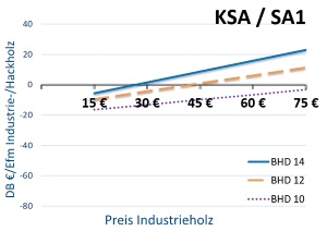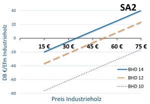 Von Maschine "SA2" wurde ausschließlich Industrieholz ausgehalten. Kronenreste und zu schwache Bäume blieben im Bestand. Die Gewinnschwellen verhalten sich ähnlich wie bei den industrie- und hackholzproduzierenden Maschinen. Die Geraden verlaufen allerdings steiler. Mit steigenden Industrieholzpreisen werden schneller höhere Deckungsbeiträge erzielt, allerdings mit fallenden Preisen auch schneller Defizite. Zu schwache Erntebestände bleiben ohne Hackholznutzung hochdefizitär.