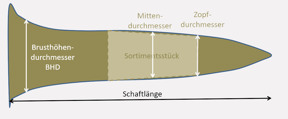 Die Einteilung nach Sortimentsdimensionen beginnt am Stammfuss und erfolgt in frei wählbaren Intervallen (in der Regel sind 50 cm sinnvoll). Auf jeder Schafthöhe wird geprüft, ob ein geforderter Mitten- respektive Zopfdurchmesser erfüllt ist (Abb. 2). Dabei erfolgt die Prüfung in der Reihenfolge der gewählten Sortierungsstrategie: In der Regel werden also zuerst die stärksten und wertvollsten Sortimente eingepasst. Wenn eine passende Position gefunden ist, ermittelt das Programm das Stückvolumen und versucht, das Sortiment schrittweise zu verlängern, bis dies nicht mehr weiter möglich ist. Dann wird das so erhaltene Stück "abgefertigt" und unter Berücksichtigung eines allfälligen Zumasses die neue Position am Schaft für die nächsten Sortimente vorgemerkt. Das vorliegende Sortierungsmodell weist alles Holz, was in einem Schaft nicht stammholztauglich ist, dem Industrie- und Energieholz zu.