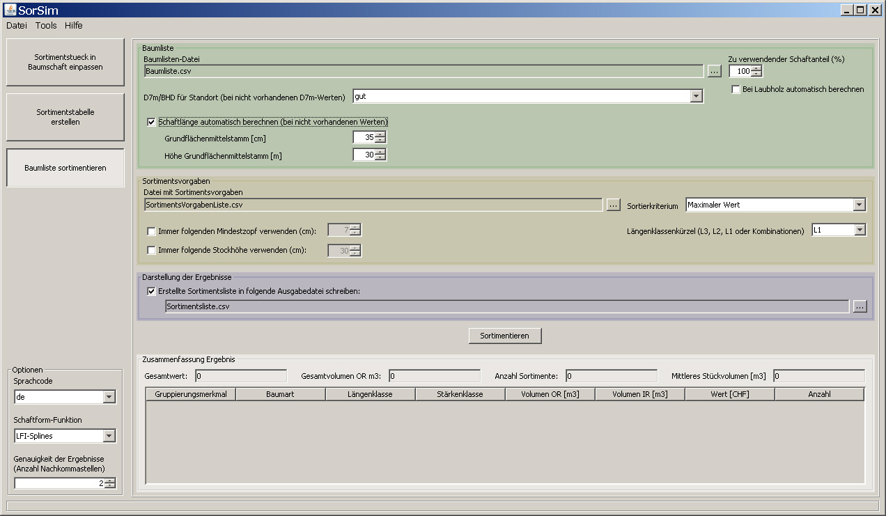 SorSim bietet die Möglichkeit, die Schafteinteilung nach verschiedenen Strategien vorzunehmen. Die Schaftfunktionen können ausgetauscht und die Sortimentsvorgaben einfach verändert werden. Die Applikation unterstützt mehrere Anzeigesprachen. Im Moment sind dies Deutsch, Französisch und Englisch. Eine detaillierte Beschreibung aller Funktionen sowie der zugrunde liegenden Berechnungsverfahren ist im mitgelieferten Handbuch enthalten.
